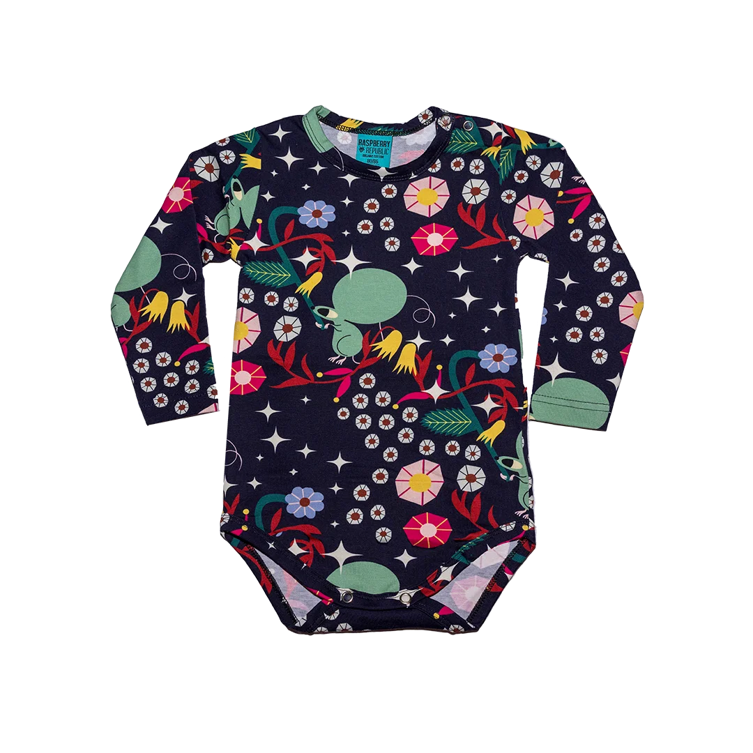 Kolorowe body niemowlęce z długim rękawem, wykonane z 95% bawełny organicznej i 5% elastanu.